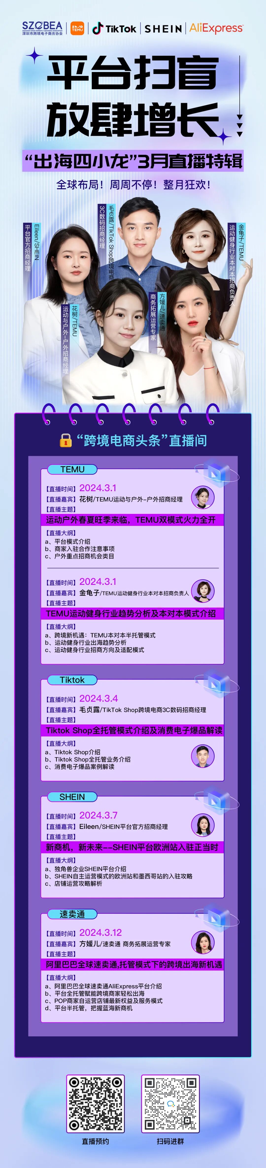 在即将到来的3月,跨境电商头条将为大家带来一场前所未有的直播盛宴——「平台扫盲!放肆增长!“出海四小龙“直播特辑」!届时由各四大平台招商经理、专家为大家提供最实用的指南,找到完整的增长方法论,实现业务飞跃。
