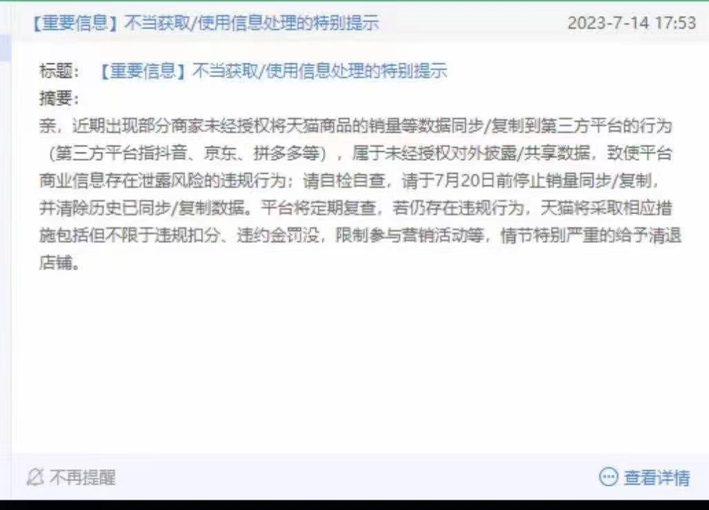 有天猫商家告诉亿邦动力,在后台收到了有关“不当获取、使用信息处理的特别提示”。根据提示,近期出现部分商家未经授权将天猫商品的销量等数据同步、复制到第三方平台的行为(第三方平台指抖音、京东、拼多多等),属于未经授权对外披露、共享数据,致使平台商业信息存在泄露风险的违规行为。平台将定期复查,若存在违规行为,天猫将采取相应措施包括但不限于违规扣分、违约金罚没,限制参与营销活动等,情节特别严重的给予清退店铺。