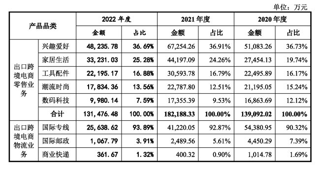 此外,三态股份还基于自身大量订单,在2009年衍生出跨境物流业务,目前已成为其第二支柱性收入来源。财报显示,2020年-2022年在总营收中占比分别为69.78%、80.40%和82.80%,分别收入13.91亿元、18.22亿元、13.15亿元。
