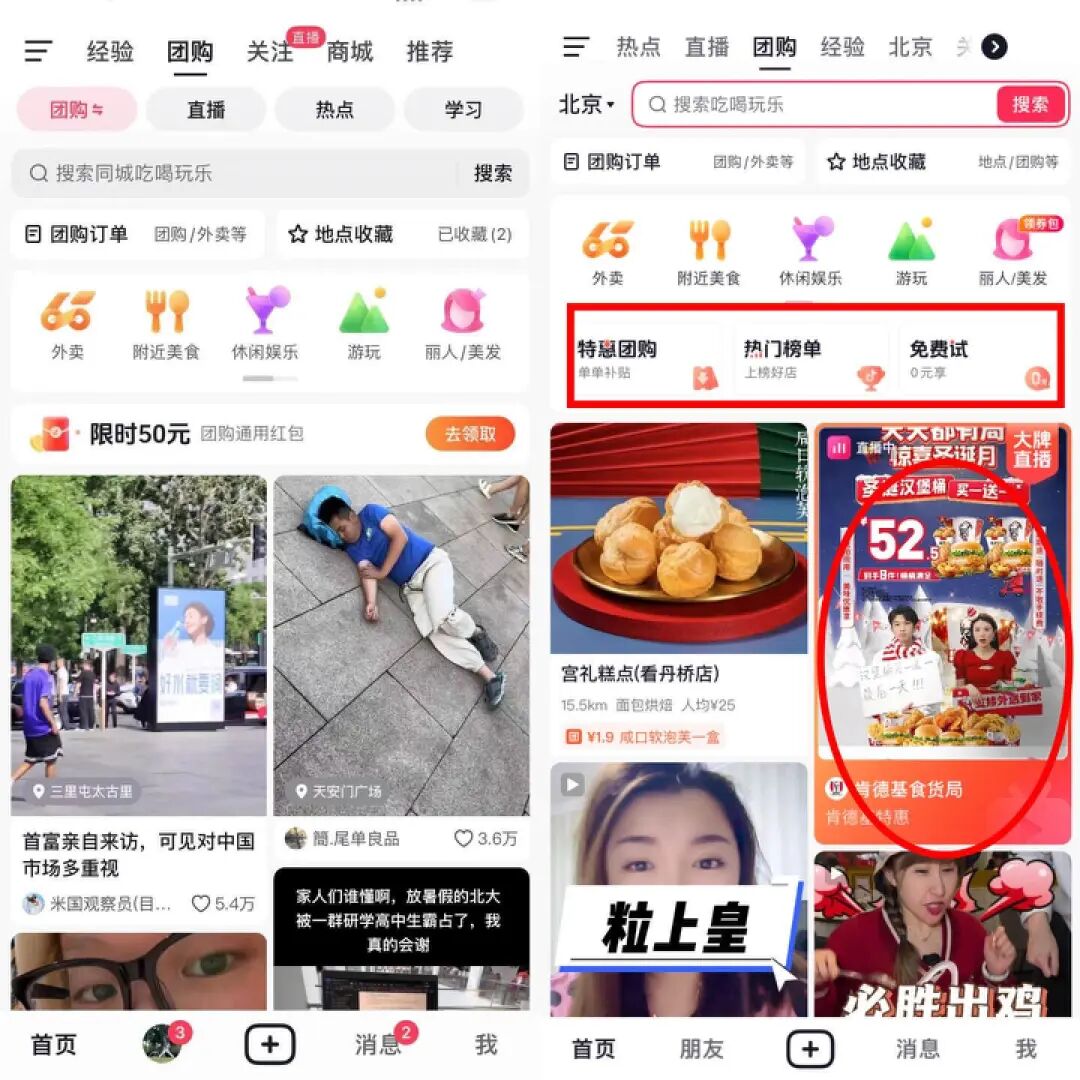 抖音团购频道进行了新一轮调整:新增“特惠团购”、“热门榜单”、“免费试”三大模块,且在页面下方的信息流推流中,直播间开始占据重要位置。如下图,其中左侧为今年7月抖音App团购频道的展示内容,右侧为当前展示内容。